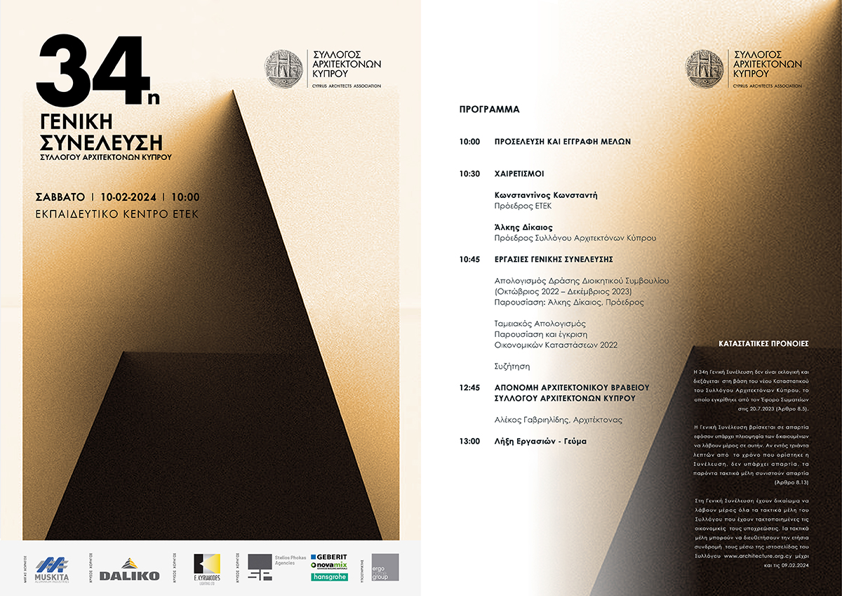 Ο Πρόεδρος και τα μέλη του Διοικητικού Συμβουλίου σας προσκαλούν στην 34η Γενική Συνέλευση του Συλλόγου Αρχιτεκτόνων Κύπρου, η οποία θα πραγματοποιηθεί το Σάββατο, 10 Φεβρουαρίου 2024, στις 10.00πμ στο Εκπαιδευτικό Κέντρο του ΕΤΕΚ. Η Γενική Συνέλευση διεξάγεται στη βάση του νέου εγκεκριμένου Καταστατικού από τον Έφορο Σωματείων (Άρθρο 8.5) και δεν είναι εκλογική.