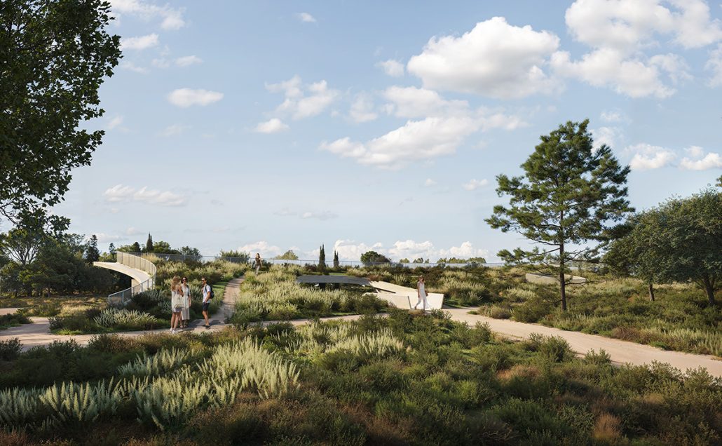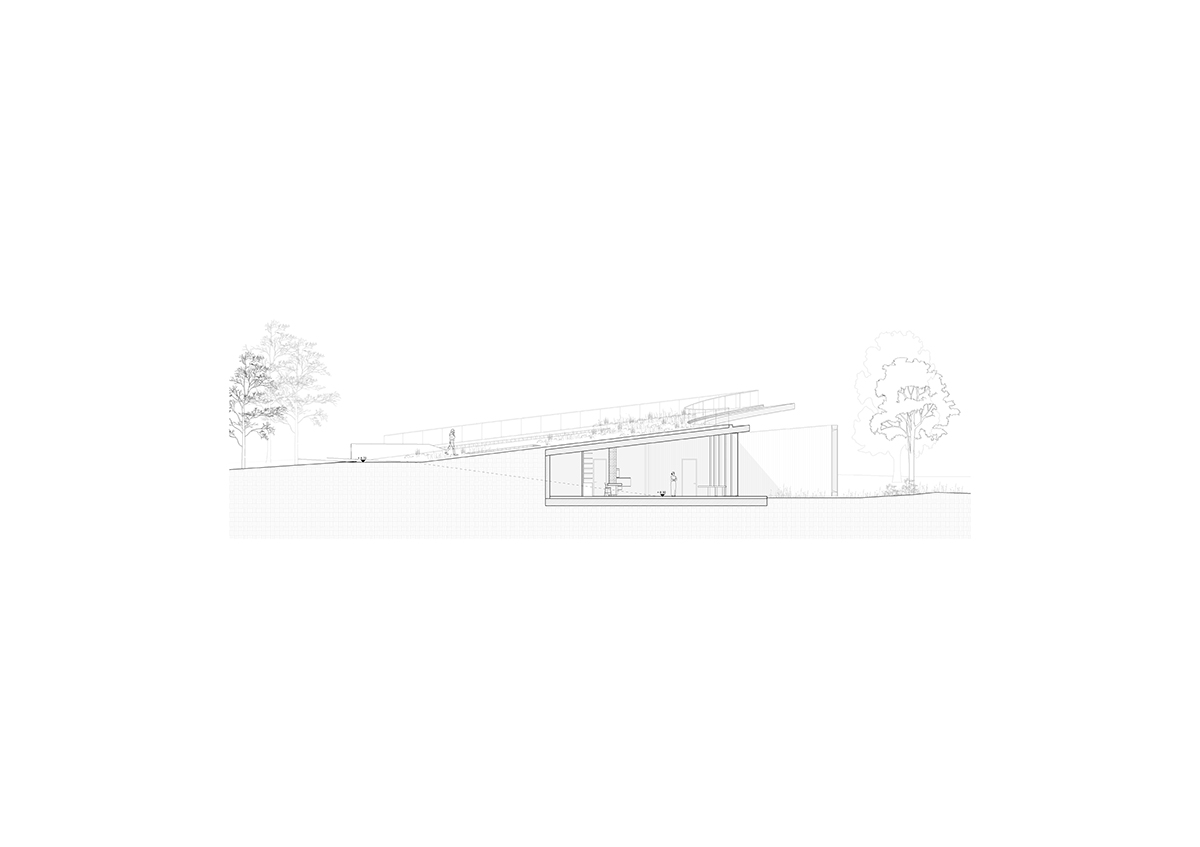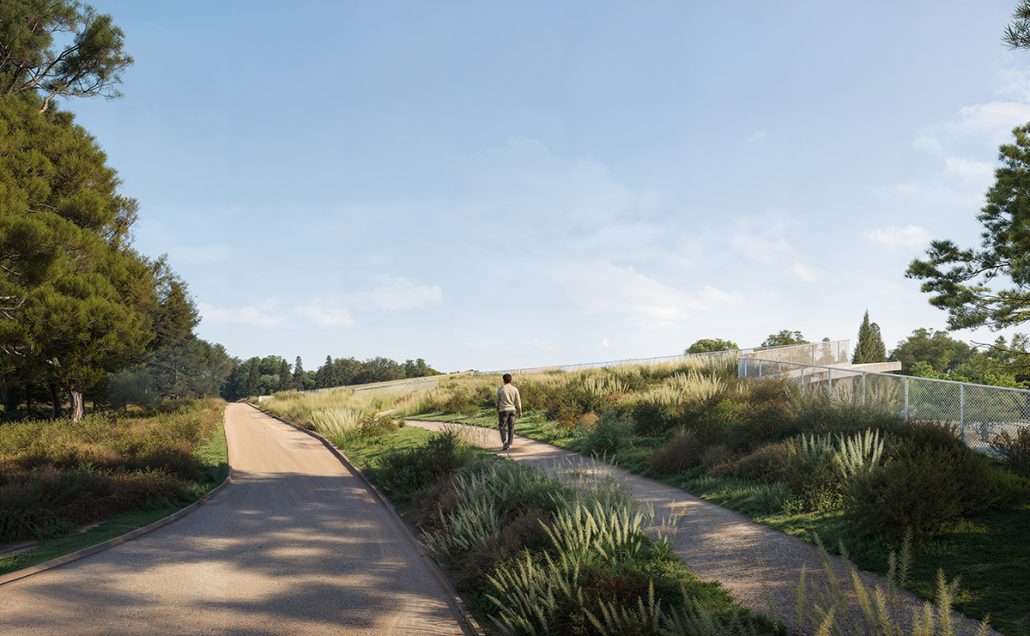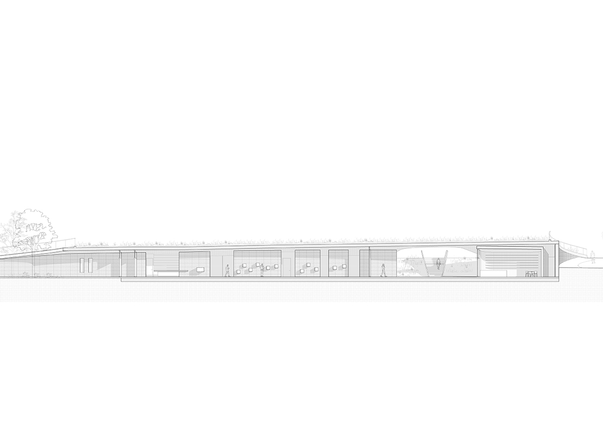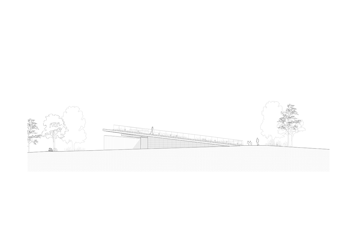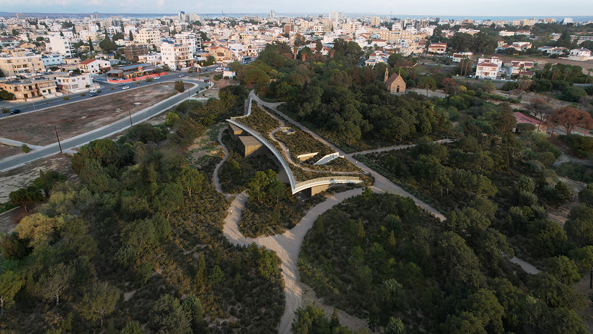 Με την πρώτη επίσκεψη, ο χώρος επέβαλλε την αναγκαιότητα επανασχεδιασμού των ορίων μεταξύ Πόλης και Πάρκου, ούτως ώστε το έργο, να είναι αναγνωρίσιμο από την πόλη χωρίς να επηρεάζει αρνητικά την διαβίωση της χλωρίδας και πανίδας της περιοχής. Μια ελαφριά βύθιση, της τάξης των 120εκ. προσαρμόζει το κτήριο στην υφιστάμενη τοπογραφία και διαμορφώνεται το εξωτερικό έδαφος. Η κύρια όψη βλέπει προς την πόλη, ενώ παράλληλα με την ένταξη της κεκλιμένης βατής οροφής, επεκτείνεται το πάρκο πάνω από το κτήριο.