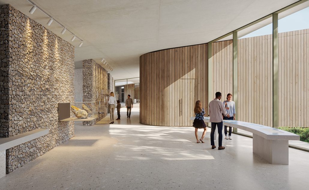 Η περιοχή των πρώην κτηρίων του Λεπροκομείου, μετατρέπεται σε ένα πλατό που υποδέχεται σημεία στάσης και πανοραμικής θέασης προς την Αλυκή. Διαμορφώνεται σε άμεση σχέση με το πρωτεύον σύστημα κυκλοφορίας, σε περίοπτη θέση και περιλαμβάνει τοπιοτέχνηση, σύστημα από πέργολες, υπαίθριους καθιστικούς χώρους και διαδραστικά σημεία ενημέρωσης. Η χωροθέτηση του κτηρίου, ανταποκρίνεται με ευαισθησία στην περιοχή NATURA 2000. Το κτήριο οριοθετήται αυστηρά εντός των ορίων πλήρους ανάπτυξης σύμφωνα με τους όρους του διαγωνισμού. Η ελαφριά βύθιση του κτηρίου, ανταποκρίνεται με σεβασμό στην υφιστάμενη τοπογραφία, δίνοντας την δυνατότητα επιτυχημένης ένταξης των προγραμματικών χώρων, δημιουργώντας παράλληλα τις συνθήκες χρήσης της οροφής ως βατό δώμα.