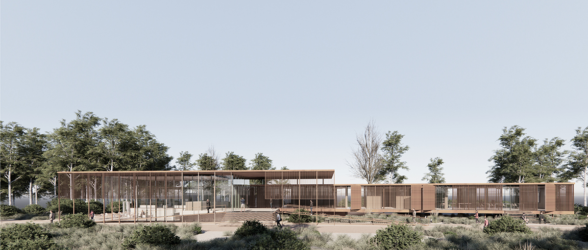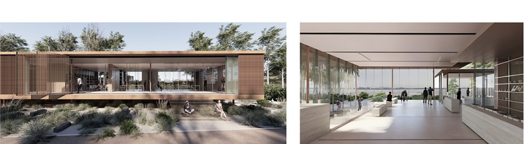 Ξεχωρίζουν σαν ανεξάρτητοι όγκοι που κάθονται πάνω στην πλατφόρμα. Ενώνονται στην μια πλευρά με το εσωτερικό ενώ στην άλλη πλευρά προβάλλουν έξω από το διαφανές περίβλημα που καθορίζει τον εσωτερικό χώρο. Δρουν σαν μεσάζοντες μεταξύ τη νότιας πλευράς που ανοίγεται προς τις αλυκές και του βόριου μέρους του πάρκου που συνορεύει με την πόλη. Η σύνθεση επιτρέπει την μελλοντική μεγέθυνση οποιουδήποτε χώρου προς τα βόρεια χωρίς να επηρεάζεται το υπόλοιπο κτήριο.