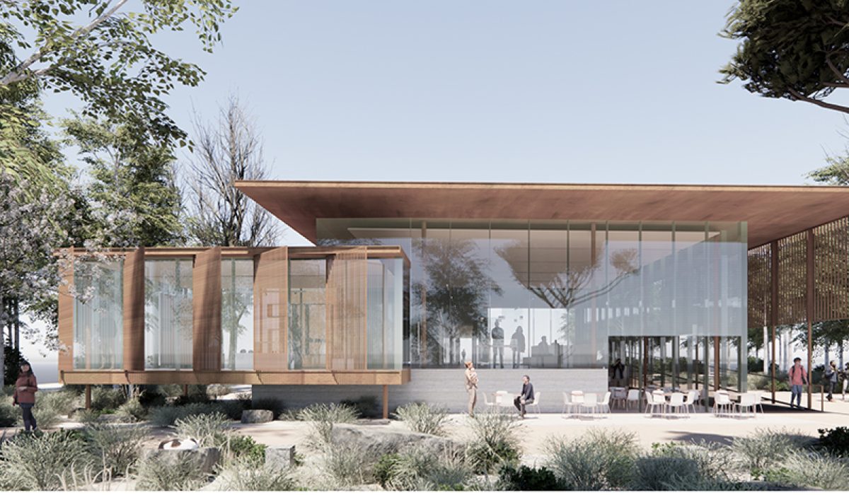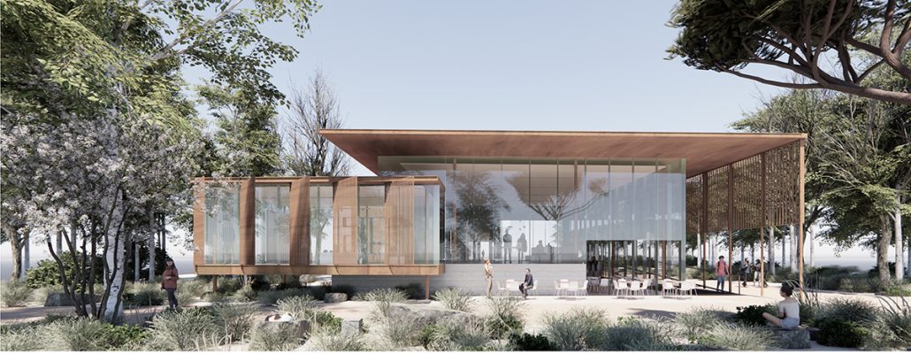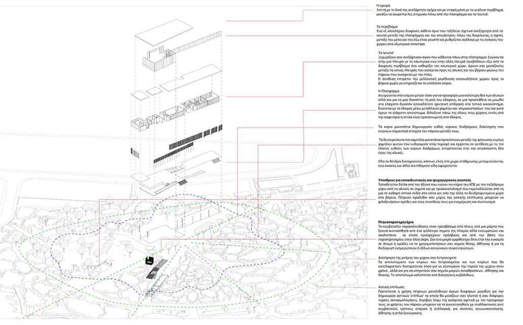 Ο μόνος χώρος στο επίπεδο του εδάφους για να μπορεί να ενώνεται με το δυτικό δενδροφυτεμένο μέρος του πάρκου αλλά και για να μην εμποδίζει την απρόσκοπτη θέα των Αλυκών από τον χώρο υποδοχής.