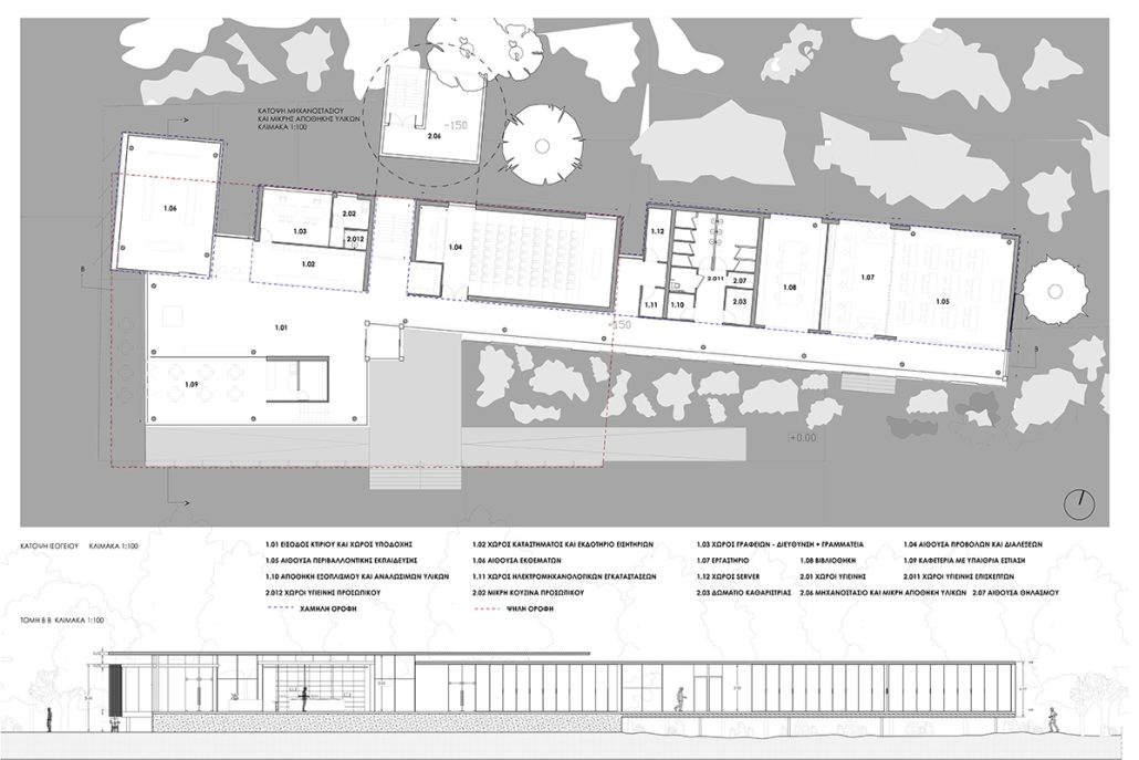 Συγκεντρώνονται σε ένα “κουτί” που τοποθετείται μεταξύ των πιο “ανοικτών” χώρων της υποδοχής και του καταστήματος στα δυτικά και τους πιο “κλειστούς” χώρους εκπαίδευσης και έρευνας στα ανατολικά.