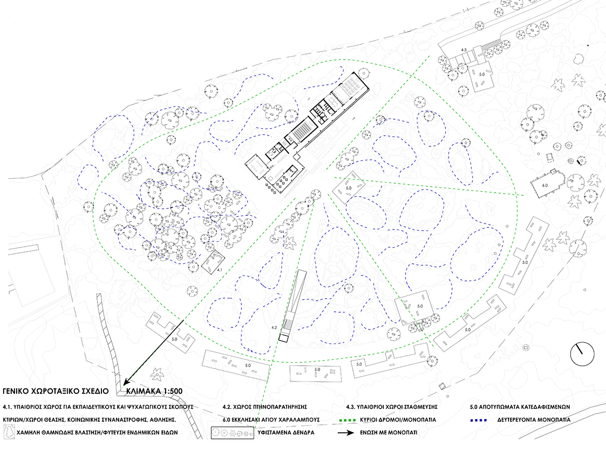 Υιοθετείται μια μινιμαλιστική προσέγγιση βάση της οποίας οι υφιστάμενοι διάδρομοι διακίνησης ενώνονται με νέα κύρια και δευτερεύοντα μονοπάτια τα οποία προσφέρουν επιλογές θέασης, απομόνωσης ή κοινωνικής συνύπαρξης.