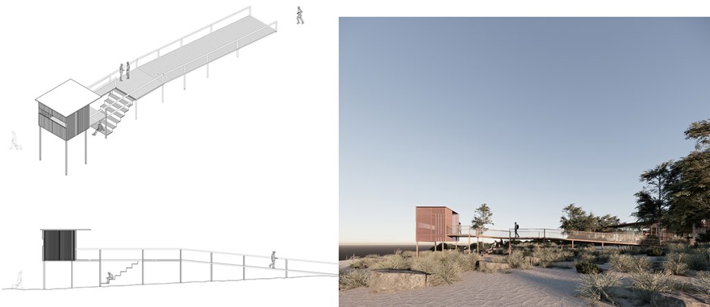 Το κουβούκλιο παρακολούθησης είναι προσβάσιμο από όλους από μια ράμπα που ξεκινά ανεπαίσθητά από ένα ψηλότερο σημείο της πλαγιάς αλλά ενσωματώνει και σκαλοπάτια τα οποία προσφέρουν πρόσβαση και από την βάση του παρατηρητηρίου στην άλλη άκρη. Σαν ένα μικρό αμφιθέατρο δίνει έτσι την ευκαιρία σε άτομα ή ομάδες να τα χρησιμοποιήσουν σαν σημείο θέσης, άθλησης ή για τη διεξαγωγή ενημερωτικών ή άλλων κοινωνικών συγκεντρώσεων.