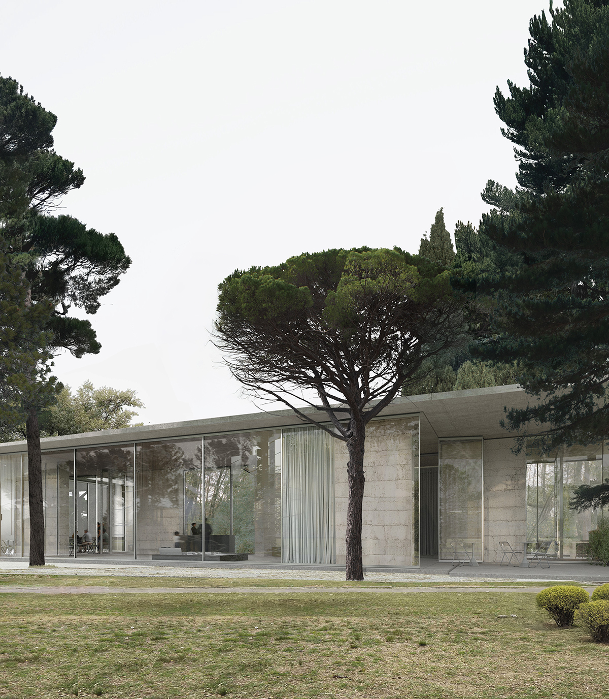 Πάνω από τα τοιχία αναπτύσσεται μία ενιαία πλάκα που ενοποιεί τη σύνθεση, δημιουργώντας στεγασμένους υπαίθριους και ημιυπαίθριους χώρους και επιτρέποντας την επέκταση των λειτουργιών του Κέντρου Περιβαλλοντικής Ενημέρωσης προς το πάρκο. Ο φλοιός συμπληρώνεται από εκτεταμένα υαλοστάσια με ανοιγόμενα τμήματα που καταργούν τα όρια μέσα / έξω, ενισχύοντας τη βιωματική διάσταση της επίσκεψης. Κλειστοί, υποστηρικτικοί χώροι (Η/Μ, χώροι υγιεινής, projection booth) αντιμετωπίζονται ως συμπαγείς όγκοι, υπενδεδυμένοι με τοπική ξυλεία.