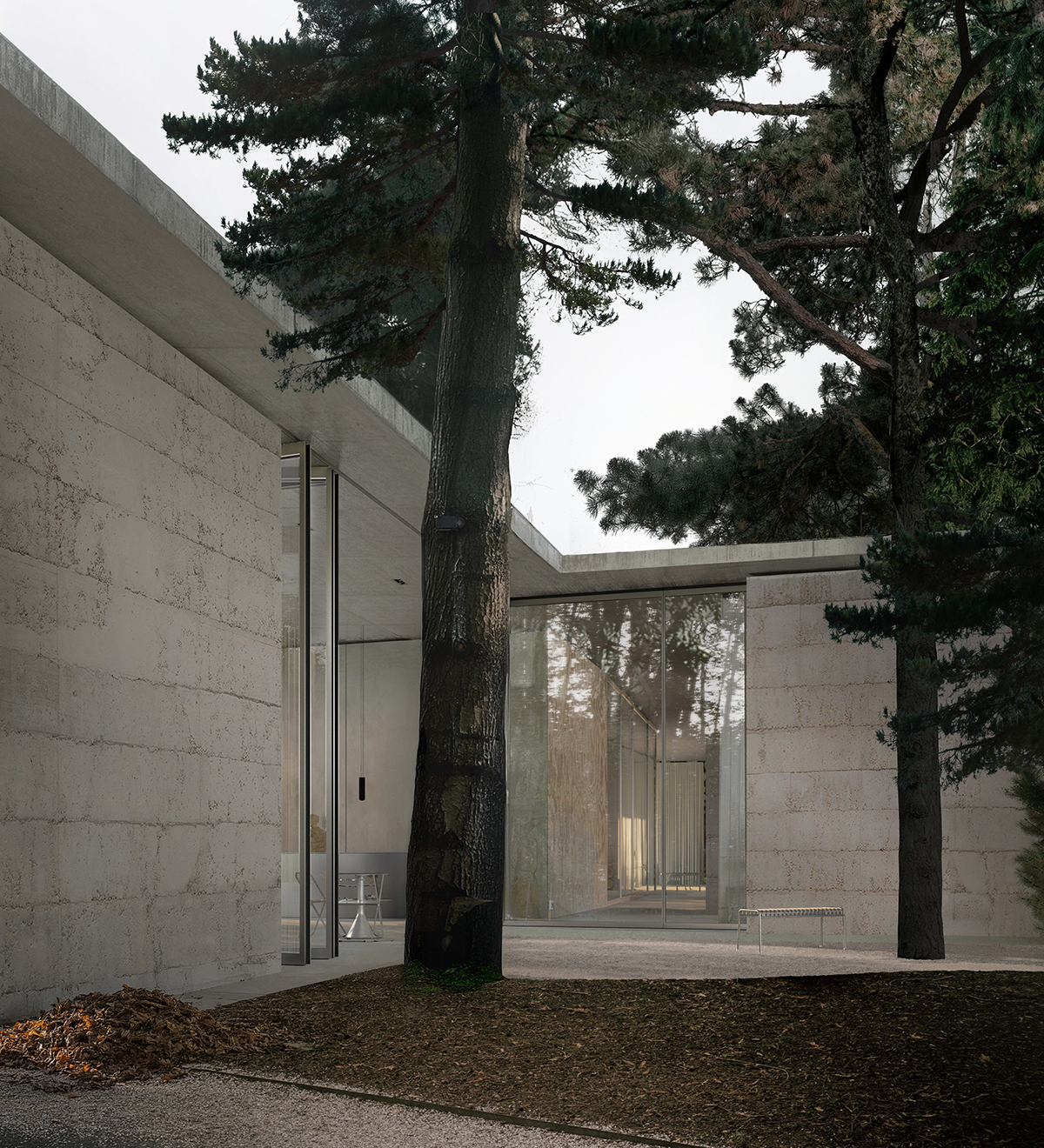 Το σύστημα αυτό κατευθύνει τη ροή των επισκεπτών και ορίζει τον τρόπο με τον οποίο οι εσωτερικοί χώροι ανοίγονται προς το τοπίο. Οι επάλληλες στρώσεις του υλικού λειτουργούν ως “φορέας αφήγησης” ενός vernacular δομικού συστήματος, συνδεδεμένου με τη βιωσιμότητα, τις θερμικές ιδιότητες της γης και τον σεβασμό στο φυσικό περιβάλλον, ενώ η χρωματική του απόδοση ακολουθεί τις αποχρώσεις του αμμώδους εδάφους των Αλυκών.