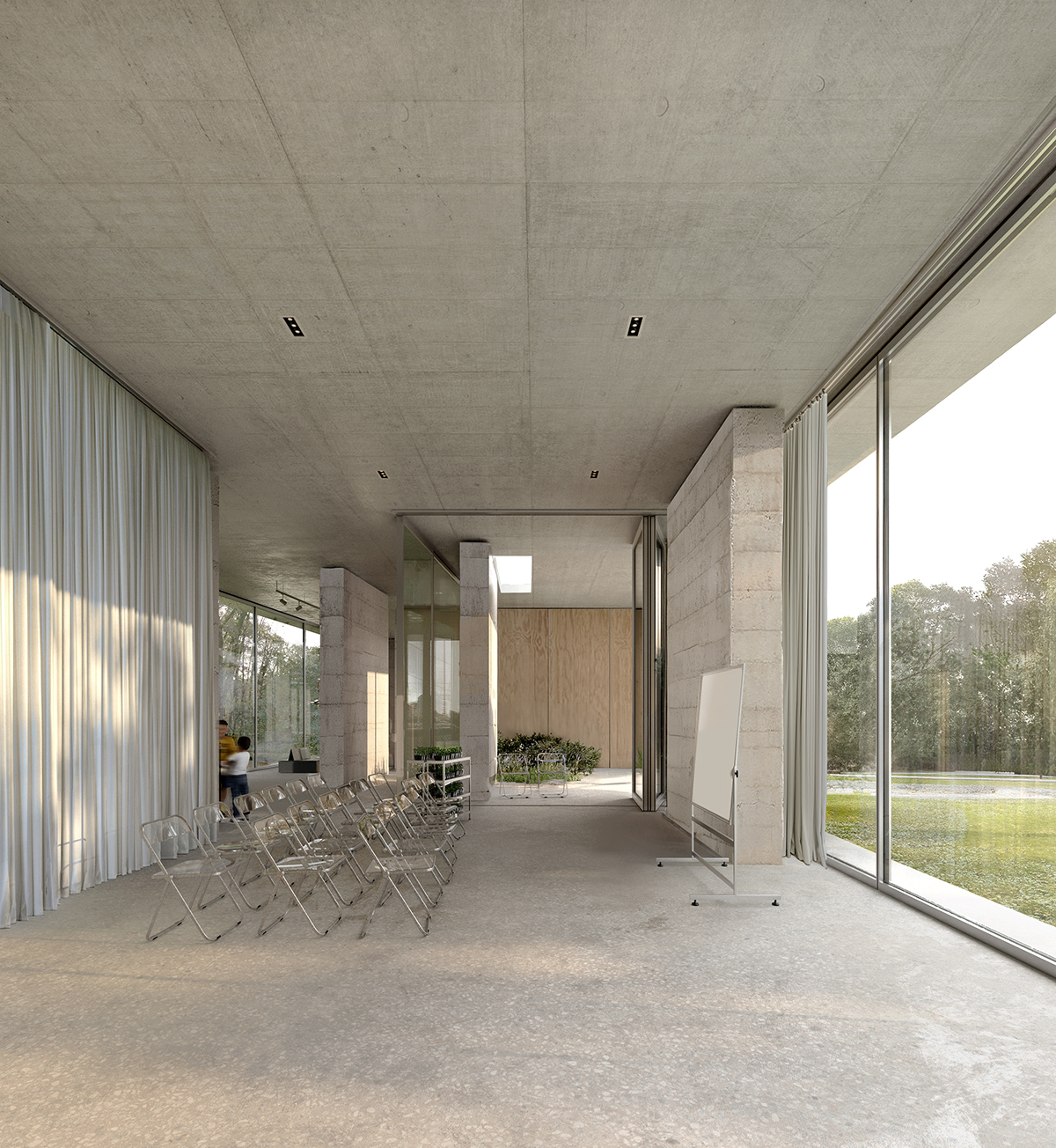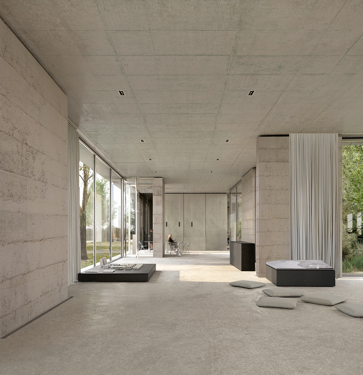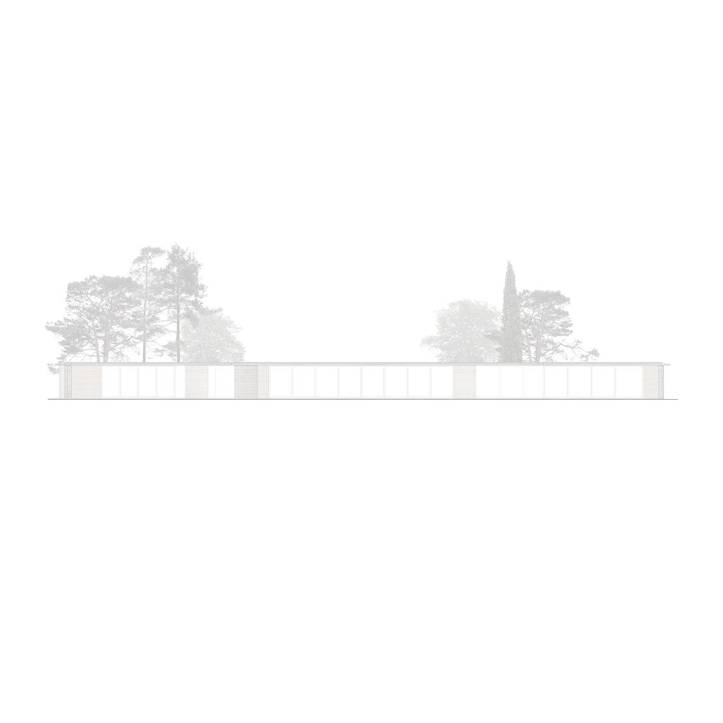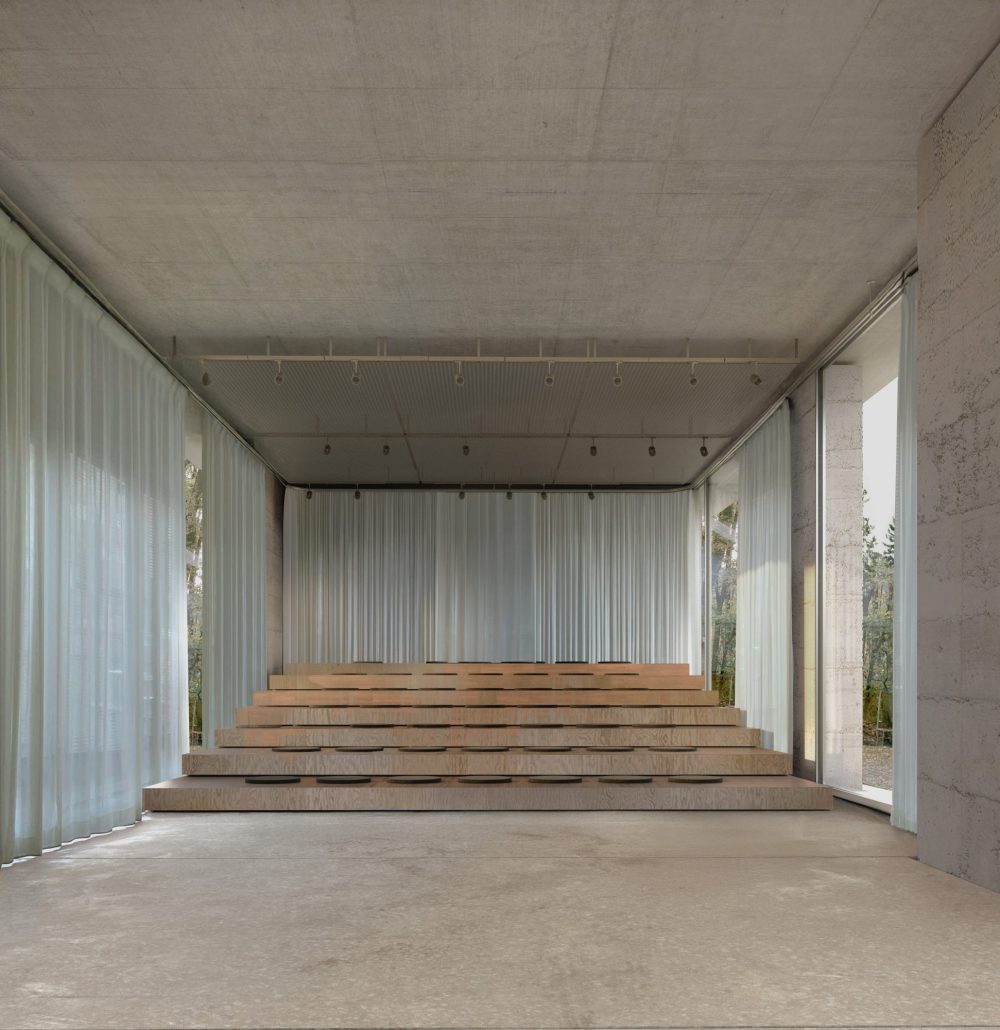 Βόρεια του κεντρικού cluster χωροθετείται ένα δεύτερο, στο οποίο αναπτύσσονται η βιβλιοθήκη, ο χώρος εργαστηρίου και τα γραφεία διοίκησης. Η βιβλιοθήκη παραμένει οπτικά και λειτουργικά ανοικτή προς το foyer, ενισχύοντας τον δημόσιο χαρακτήρα του χώρου. Η αίθουσα διαλέξεων αναπτύσσεται σε άμεση εγγύτητα. Πρόκειται για έναν ευέλικτο και πολυμορφικό χώρο, ικανό να προσαρμόζεται σε διαφορετικά σενάρια χρήσης, ο οποίος δύναται να ανοίγει είτε προς τον υπαίθριο χώρο είτε προς τον εφαπτόμενο ημιυπαίθριο στεγασμένο χώρο.