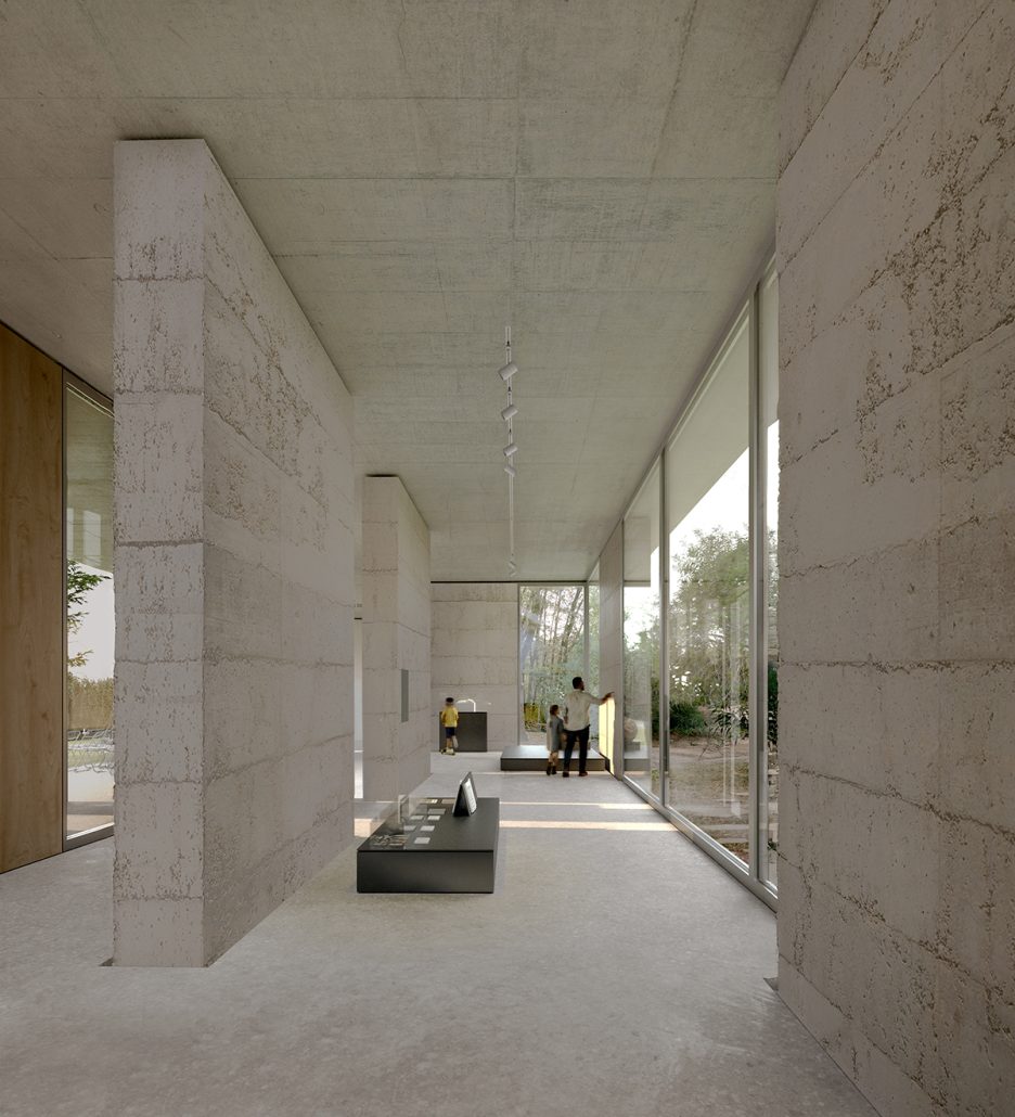 Ο εκθεσιακός χώρος αναπτύσσεται νότια του cluster εισόδου. Το δομικό σύστημα του κτιρίου οριοθετεί οργανικά έναν ευέλικτο χώρο, ικανό να υποστηρίξει διαφορετικά μουσειολογικά σενάρια, εντός του οποίου η θέα προς το περιβάλλον τοπίο συνδιαλέγεται άμεσα με τα εκθέματα. Η αίθουσα περιβαλλοντικής εκπαίδευσης χωροθετείται στο νότιο άκρο του κτιριακού συγκροτήματος και σχεδιάζεται ως ένας διαδραστικός και ευμετάβλητος χώρος μάθησης. Ο χώρος ανοίγεται προς έναν δεύτερο, εφαπτόμενο ημιυπαίθριο στεγασμένο χώρο, επιτρέποντας την ανάπτυξη εναλλακτικών σεναρίων εκπαιδευτικών και βιωματικών δραστηριοτήτων.