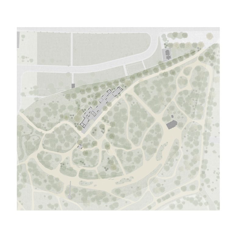 Η τοπιακή μελέτη δομείται σε ζώνες διαφορετικής έντασης επέμβασης, με αποκλειστική χρήση ιθαγενών φυτικών ειδών, ενίσχυση του μικροκλίματος και πρόβλεψη οικολογικής αποκατάστασης. Οι κινήσεις και οι επιφάνειες επιλέγονται με λογική ελαχιστοποίησης εκσκαφών και σκληρών υλικών: υδατοδιαπερατή άσφαλτος στον άξονα άφιξης και συμπιεσμένο χώμα στα μονοπάτια και στα σημεία στάσης. Η είσοδος του χώρου πρασίνου στο αστικό μέτωπο συγκροτείται ως μία δημόσια «πλατεία» με κυβόλιθο τοπικής πέτρας, ενώ ο χώρος στάθμευσης οργανώνεται γραμμικά.