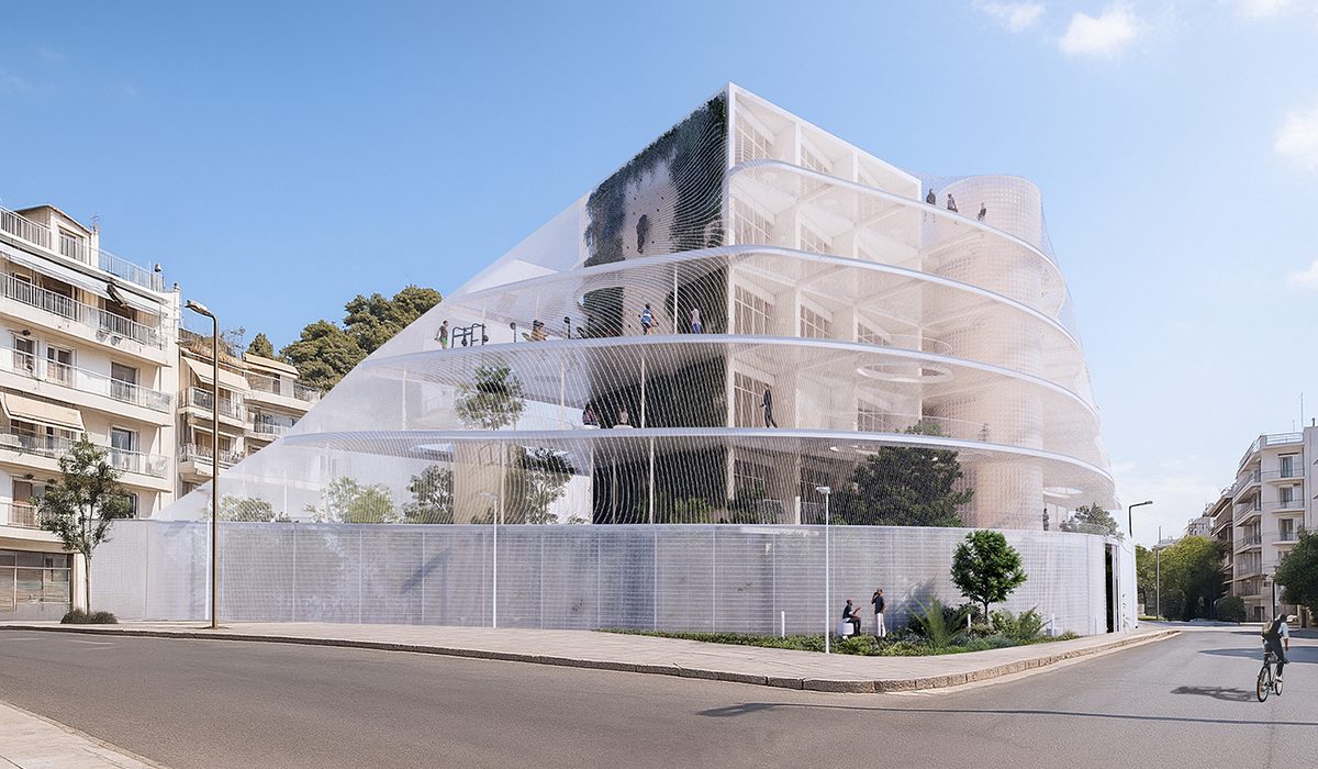 - Το Πλέγμα: Το μεταλλικό περίβλημα και οι διάτρητες βεράντες φιλτράρουν το φως και μειώνουν την ηλιακή ακτινοβολία.