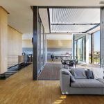 Η μεταλλική σκάλα, παράλληλα με το αίθριο, σε οδηγεί στο ισόγειο ένα ορθογώνιο κουτί από εμφανές μπετόν βυθισμένο στο έδαφος. Η μερική βύθιση του όγκου των ιδιωτικών χώρων, στοχεύει στην εκμετάλευση της γης σαν υλικό θερμομόνωσης. Tο ισόγειο χωρίζεται σε δύο ενότητες, τον οικογενειακό χώρο με τον χώρο μελέτης και τις υπηρεσίες και τον χώρο των υπνοδωματίων και χώρων υγιεινής με εσωτερικούς κήπους. Όλα τα υπνοδωμάτια έχουν νότιο προσανατολισμό με το δικό τους ιδιωτικό του κήπο. Οι βιοκλιματικές λύσεις που ενσωματώθηκαν στην κατοικία, στοχεύουν στην μείωση της κατανάλωσης ενέργειας και προσφέρουν ένα πιο ευχάριστο και ποιοτικό περιβάλλον στην οικογένεια.