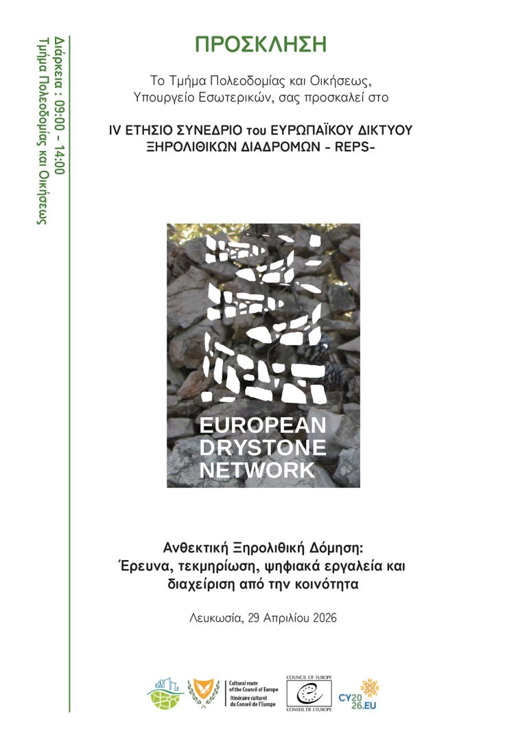 Ο Διευθυντής του Τμήματος Πολεοδομίας και Οικήσεως σας προσκαλεί στο IV Ετήσιο Συνέδριο του Ευρωπαϊκού Δικτύου Ξηρολιθικών Διαδρομών (REPS), με θέμα: “Ανθεκτική Ξηρολιθική Δόμηση: Έρευνα, τεκμηρίωση, ψηφιακά εργαλεία και διαχείριση από την κοινότητα”.