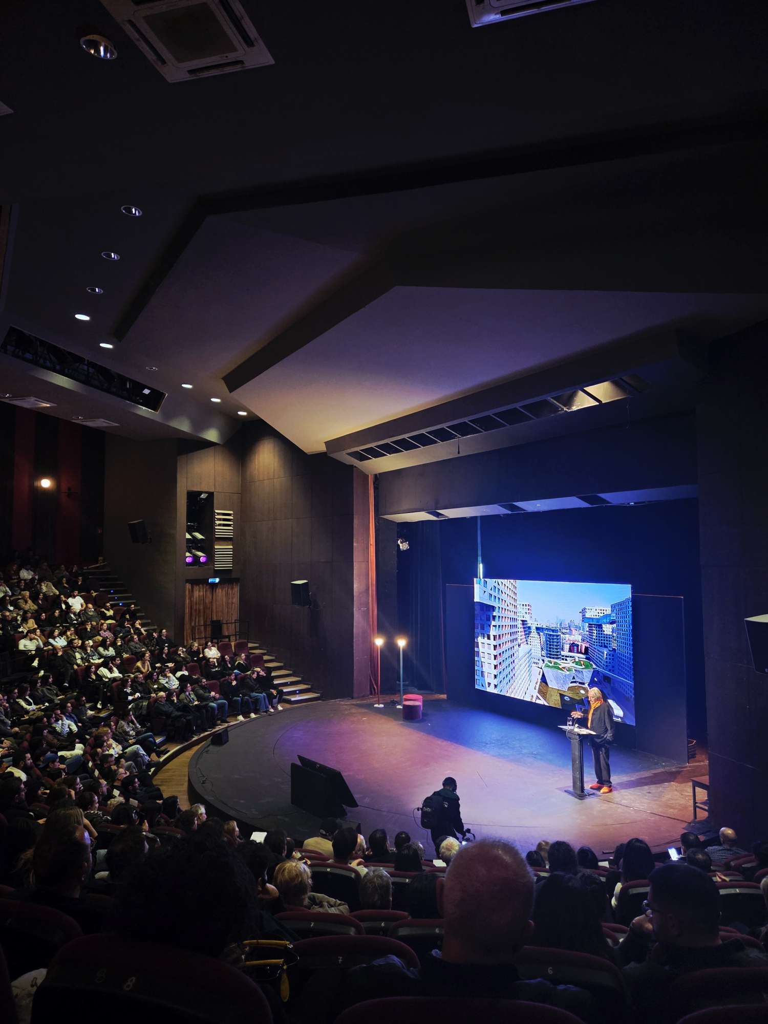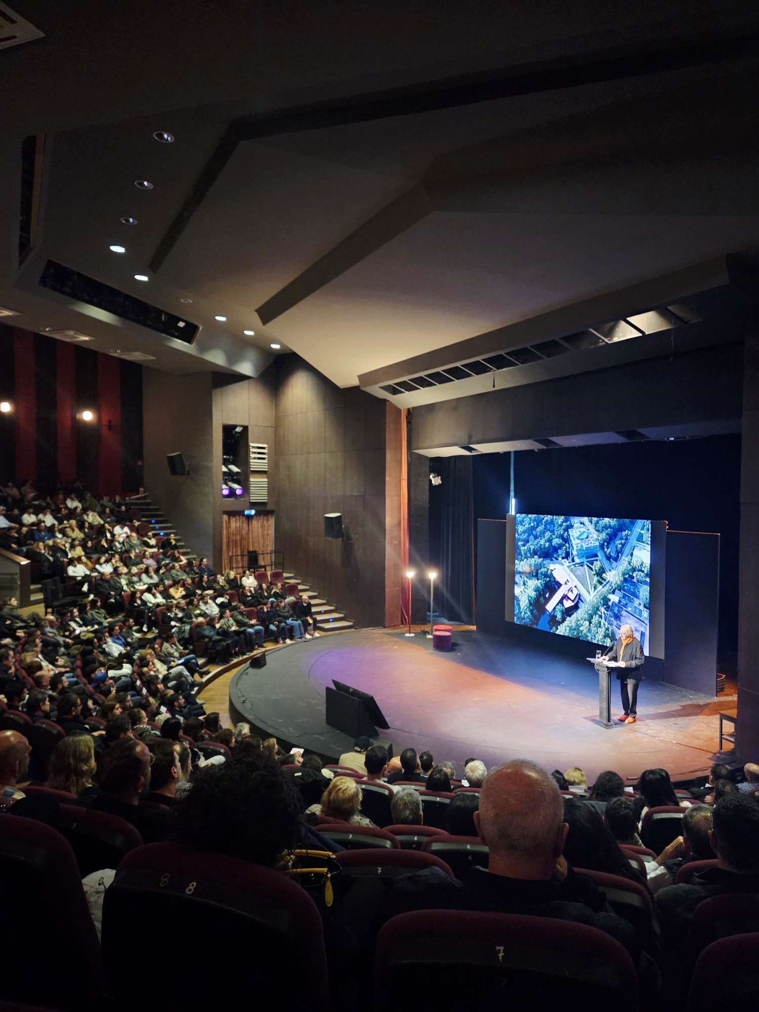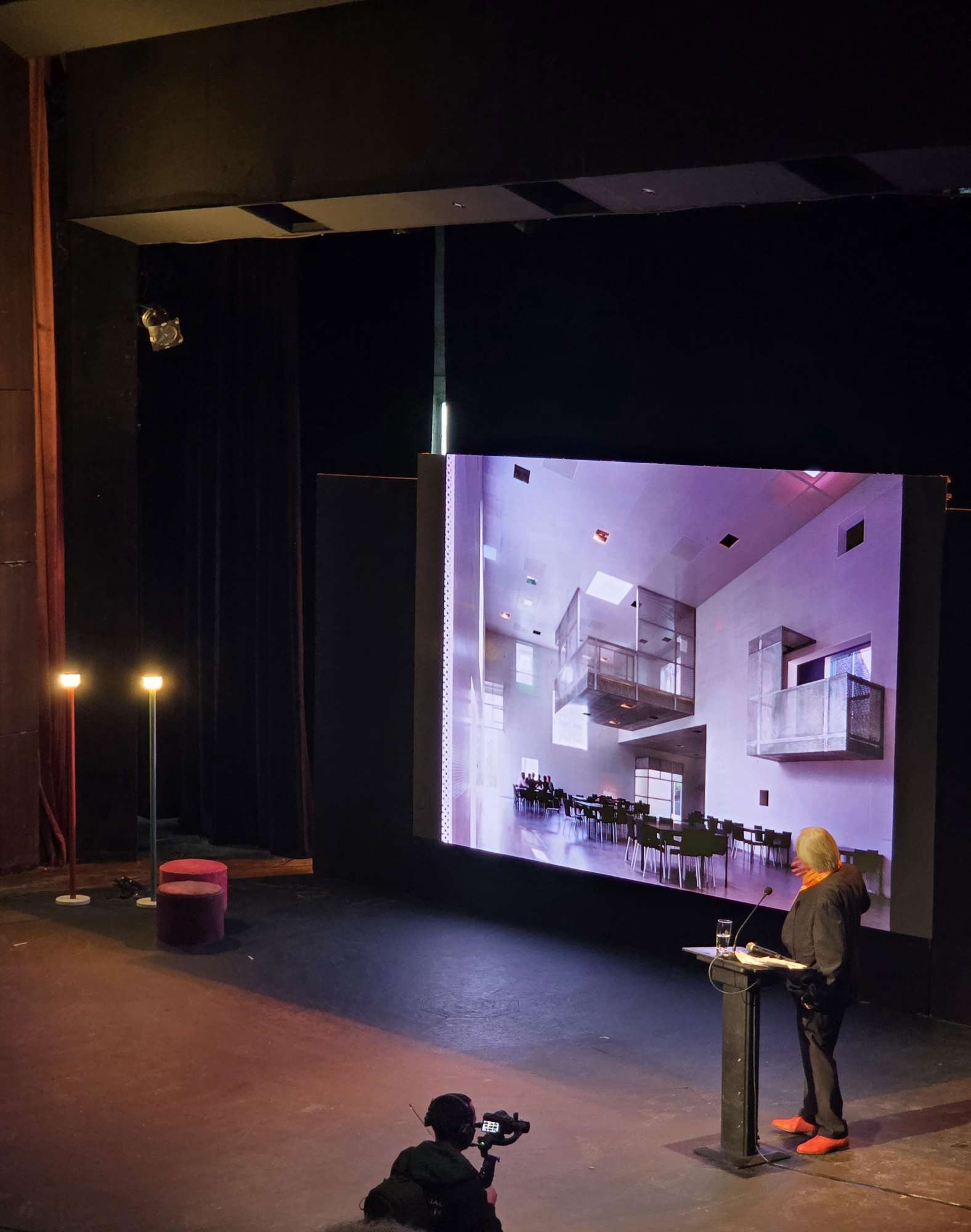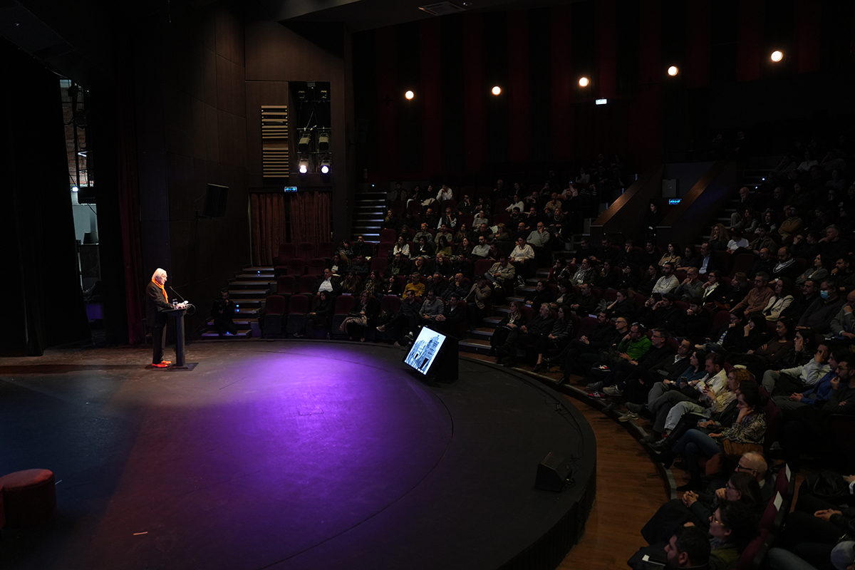Η διάλεξη, με τίτλο “Imaginary Causes”, πραγματοποιήθηκε στην Κεντρική Σκηνή του Σατιρικού Θεάτρου και συγκέντρωσε σημαντικό ενδιαφέρον από φοιτητές, ακαδημαϊκούς και επαγγελματίες του χώρου της αρχιτεκτονικής, οι οποίοι είχαν την ευκαιρία να παρακολουθήσουν μια ιδιαίτερα εμπνευσμένη παρουσίαση γύρω από το έργο, τη φιλοσοφία και τη δημιουργική προσέγγιση του Αρχιτέκτονα.