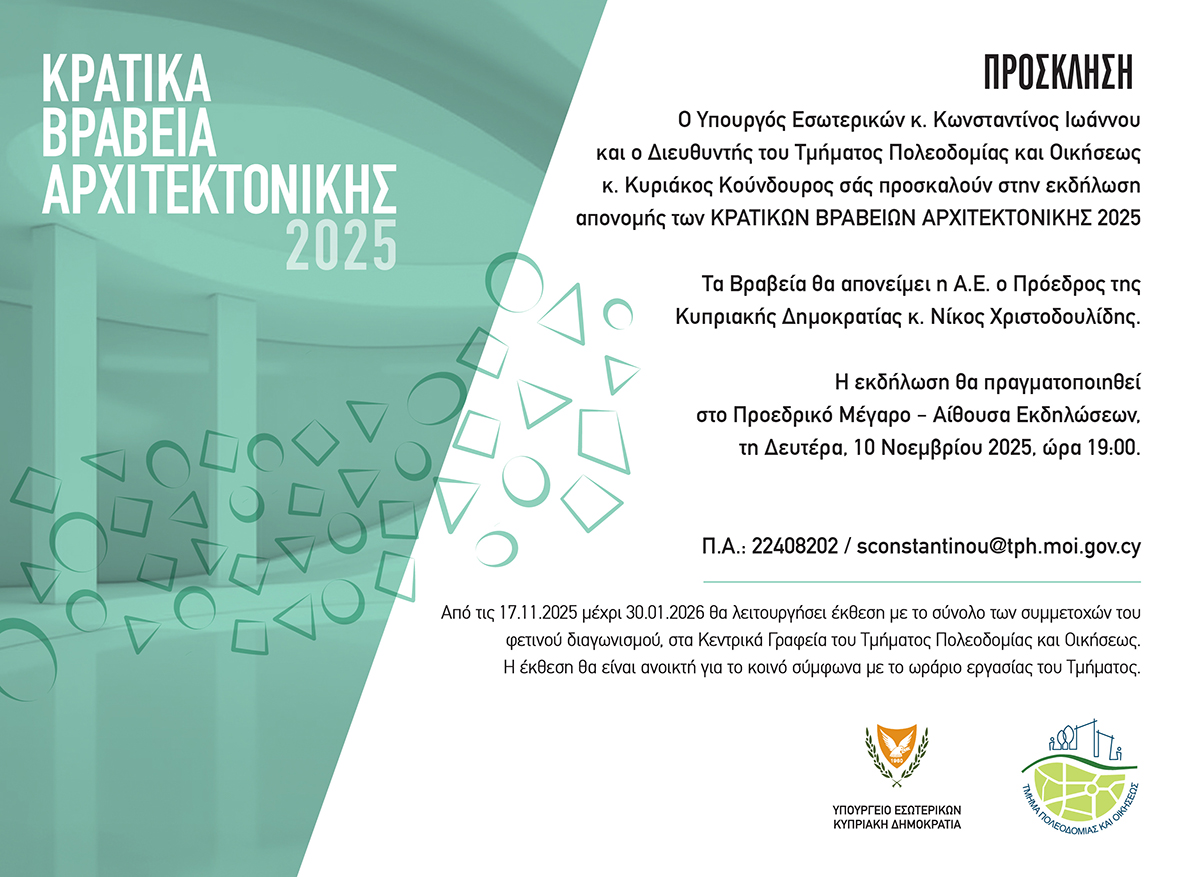 O Υπουργός Εσωτερικών κ. Κωνσταντίνος Ιωάννου και ο Διευθυντής του Τμήματος Πολεοδομίας και Οικήσεως κ. Κυριάκος Κούνδουρος σας προσκαλούν στην εκδήλωση απονομής των Κρατικών Βραβείων Αρχιτεκτονικής 2025.