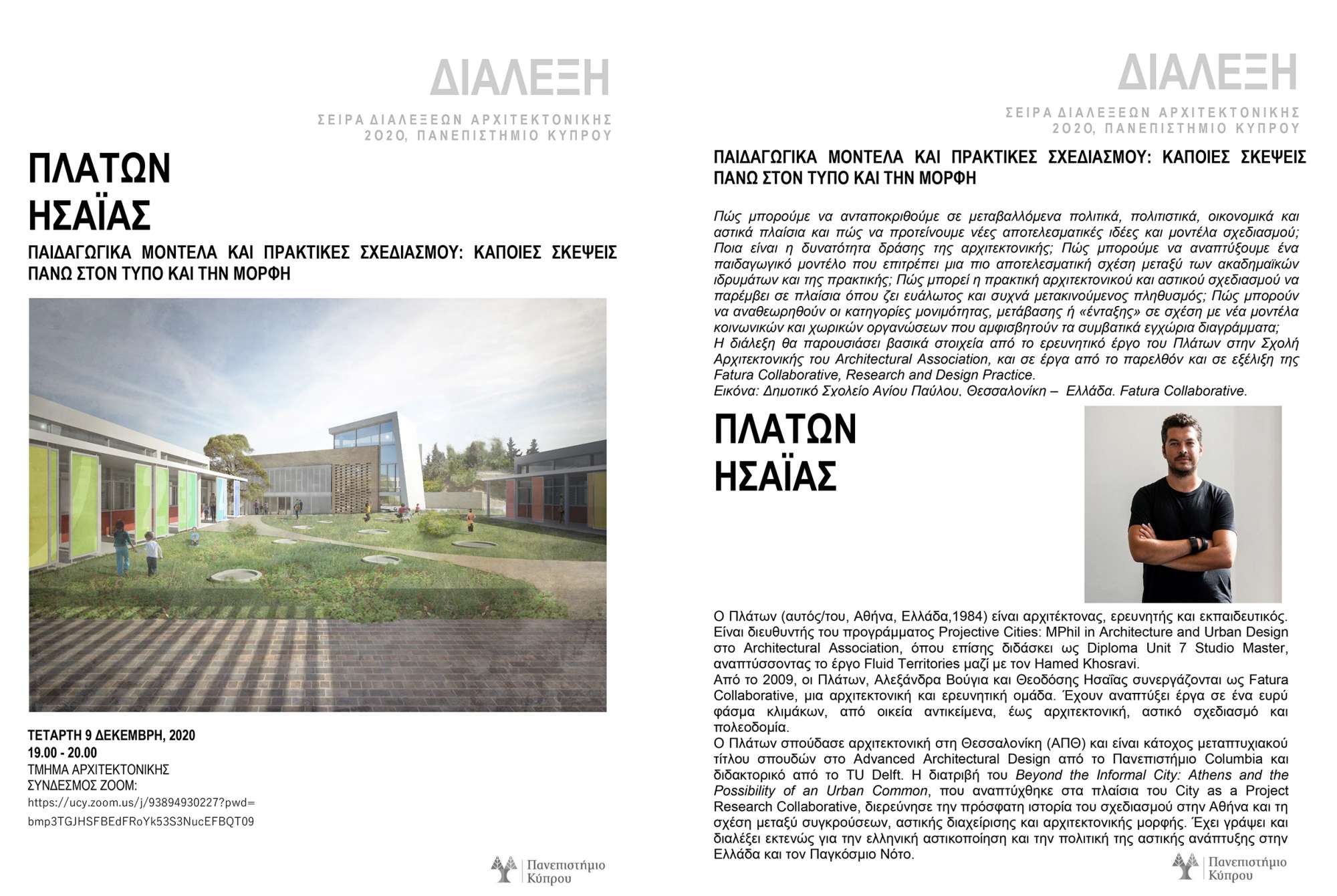 Το Τμήμα Αρχιτεκτονικής του Πανεπιστημίου Κύπρου σας προσκαλεί στην διαδικτυακή διάλεξη με θέμα “ΠΑΙΔΑΓΩΓΙΚΑ ΜΟΝΤΕΛΑ ΚΑΙ ΠΡΑΚΤΙΚΕΣ ΣΧΕΔΙΑΣΜΟΥ: ΚΑΠΟΙΕΣ ΣΚΕΨΕΙΣ ΠΑΝΩ ΣΤΟΝ ΤΥΠΟ ΚΑΙ ΤΗΝ ΜΟΡΦΗ” του Επισκέπτη Καθηγητή Πλάτωνα Ησαΐα.