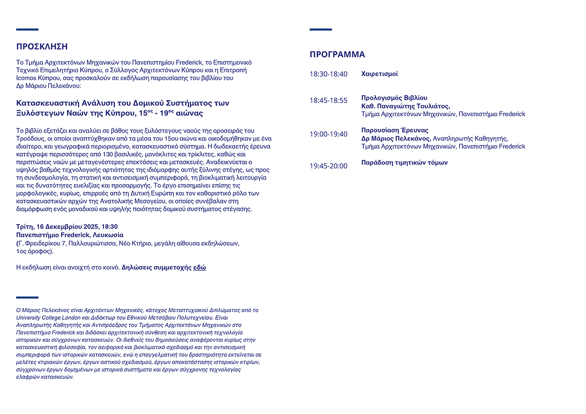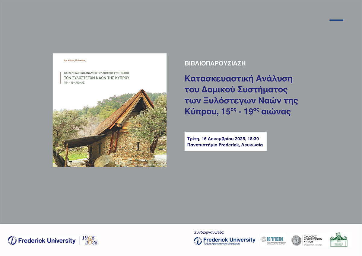 Το Τμήμα Αρχιτεκτόνων Μηχανικών του Πανεπιστημίου Frederick, το Επιστημονικό Τεχνικό Επιμελητήριο Κύπρου, ο Σύλλογος Αρχιτεκτόνων Κύπρου και η Επιτροπή Icomos Κύπρου, σας προσκαλούν σε εκδήλωση παρουσίασης του βιβλίου του Δρ. Μάριου Πελεκάνου “Κατασκευαστική Ανάλυση του Δομικού Συστήματος των Ξυλόστεγων Ναών της Κύπρου, 15ος – 19ος αιώνας”